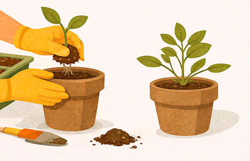 Når plantene har vokst seg litt større og har flere blader, er det på tide å plante dem om i større potter. Dette gir røttene mer plass til å utvikle seg.