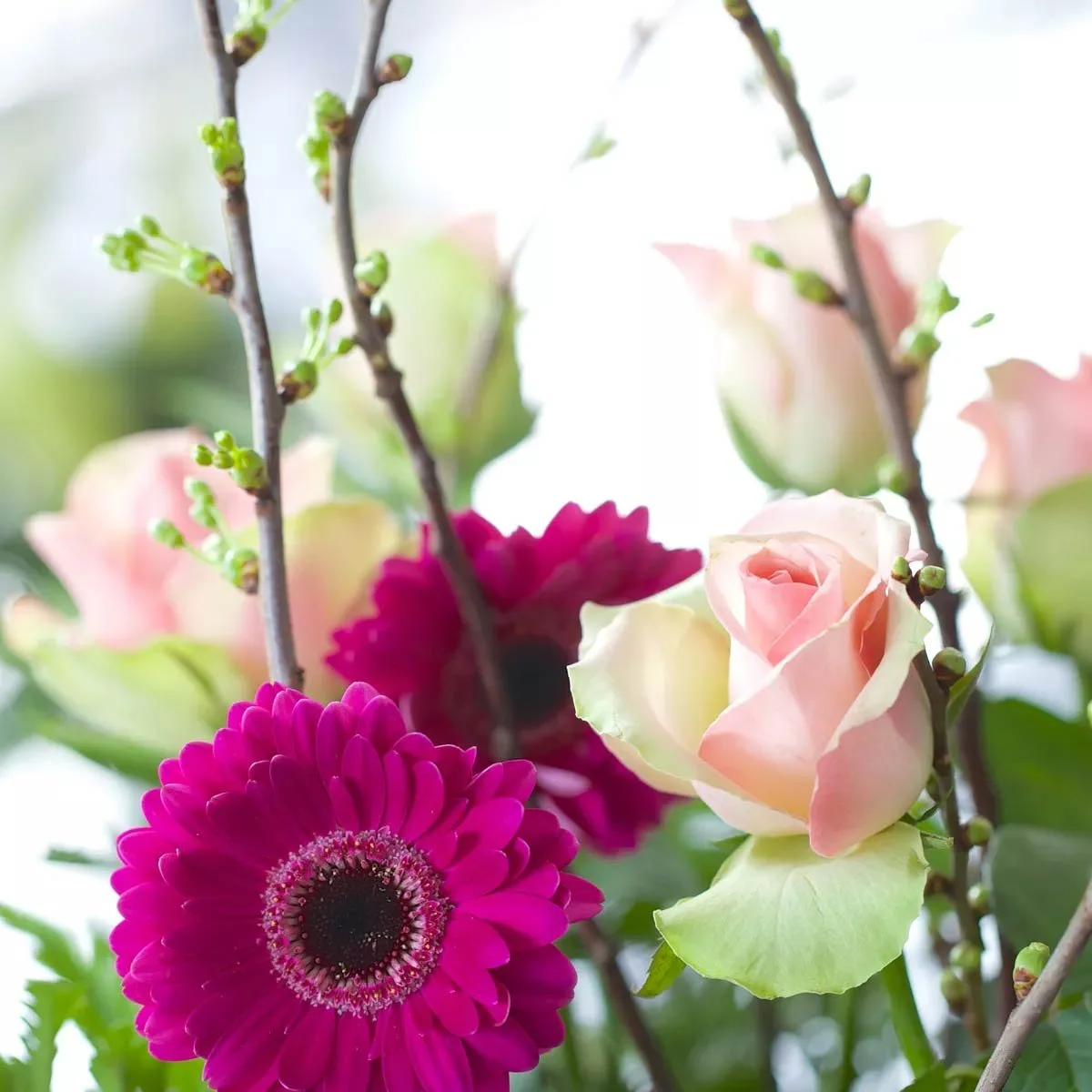 Kombiner gjerne blomstene med grønne kvister og bladverk. Dette gir buketten mer volum og et naturlig uttrykk. Grønt fungerer som ramme og fremhever blomstene på en elegant måte.
