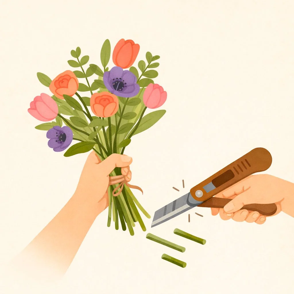 Når du kutter stilkene på nytt, åpnes blomstens vannkanaler. Dette gjør at blomstene lettere tar opp vann og holder seg friske lengre.