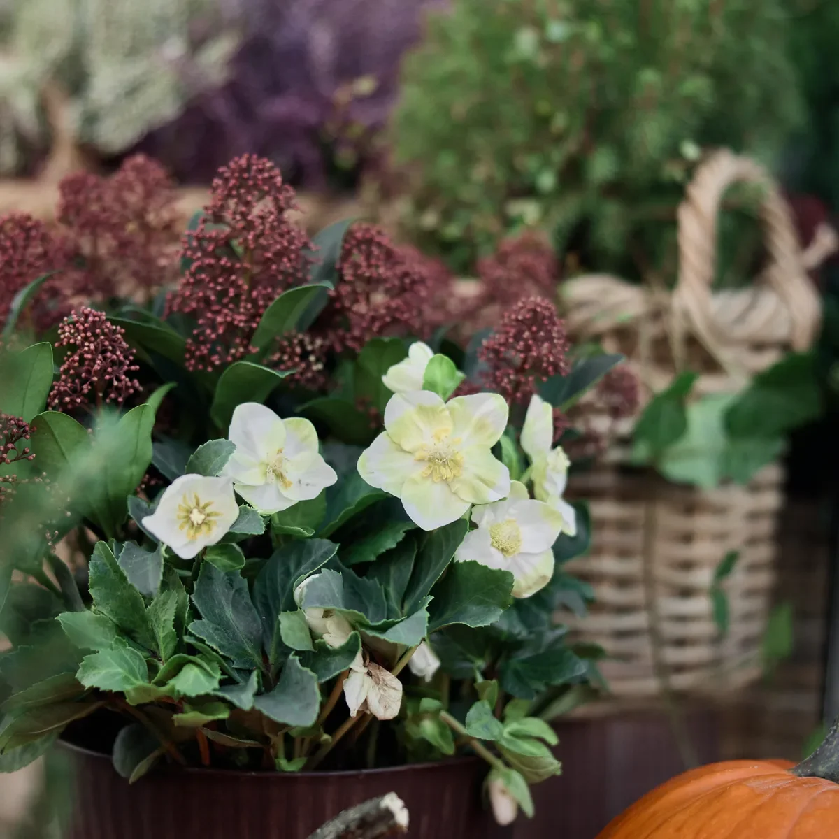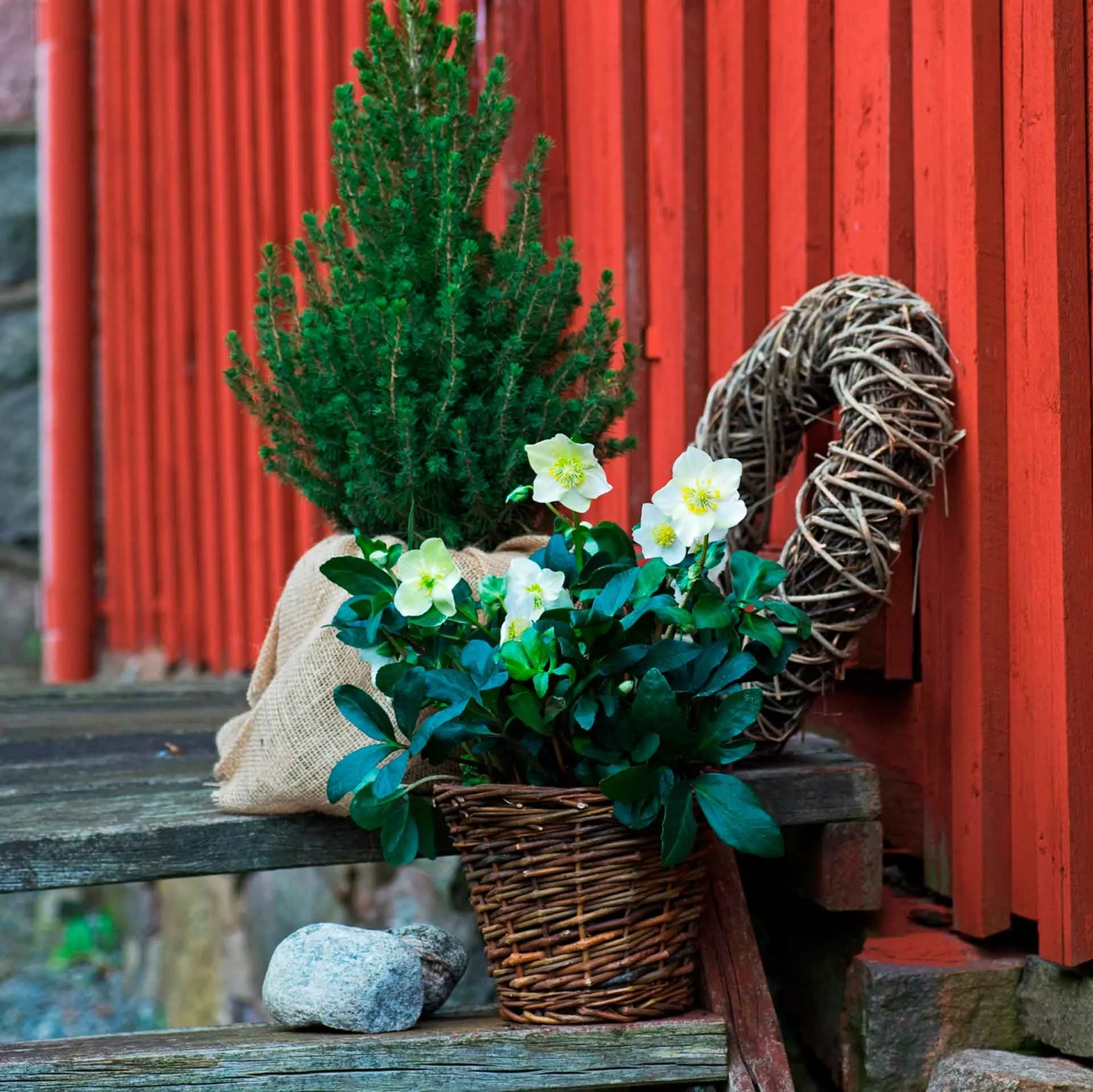 Kombiner gjerne juleroser med vintergrønne busker som kinaeiner, sypress eller dverggran for et frodig og levende uttrykk selv i den kaldeste årstiden. Pynt med lyslenker og lykter for en varm og innbydende stemning som ønsker både deg og gjestene velkommen i vintermørket.