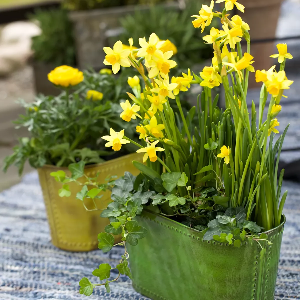 En klassisk vårptte kan bestå av påskeliljer i midten, stemorsblomster rundt kanten og eføy som henger over. Dette gir en frodig potte som tåler kjølige vårdager.